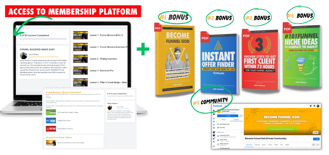 Our A-Z implementation video course teaches you how to build a funnel agency or become a full-time funnel builder, without depending on a boring 9-5 job. By taking this course, you can double your previous job salary in your first month of business income with our proven Funnel God system.